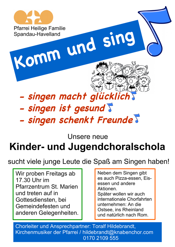 Doch keine Angst, die neue Schola ist auch für Laien gedacht, die einfach Freude am Singen haben oder sich darin ausprobieren wollen und bereit sind in Gottesdiensten und für die Gemeinden in unserer Pfarrei zu singen. Proben sind donnerstags um 18 Uhr, im Gemeindehaus von Maria, Hilfe der Christen in Spandau. Herr Hildebrandt bittet um vorige Anmeldung und beantwortet auch gerne Ihre Fragen: hildebrandt@knabenchor.com