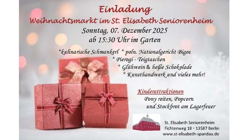 Im Seniorenheim St. Elisabeth wird es einen Weihnachtsmarkt im Garten geben, am Sonntag, den 7.12., ab 15.30 Uhr. Es gibt neben Kunsthandwerklichem auch kulinarische Spezialitäten & Glühwein, sowie Stockbrot am Lagerfeuer für Kinder.